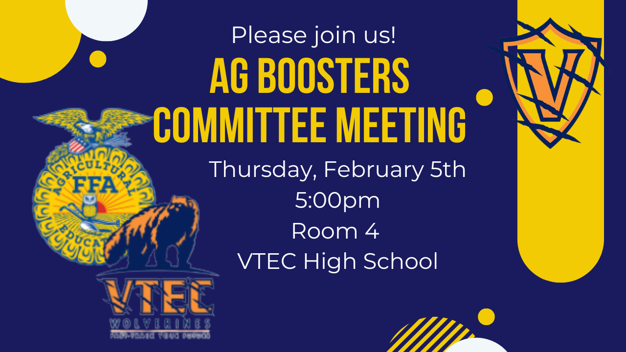 Ag Boosters Club Meeting - Thursday, February 5th at 5pm in Room 4. All are welcome. See attached flyers.